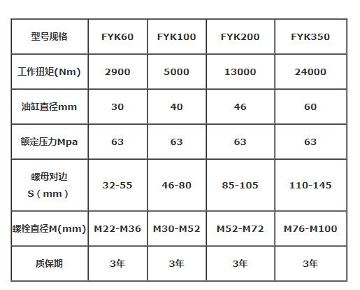 FYK Hollow Hydraulic Spanner, Hydraulic Torque Spanner, Hydraulic Torque Spanner: Max use of high strength light metal, forming power head in one body, improve strength and life in an all-round way; Big torque/weight ratio, double-acting, high speed, large rotation angle, high efficiency, one power head can cooperate with a variety of working heads, wide range of work, 360 degree rotating hose joint makes it easy to use in narrow space. When the mechanism is never jammed, the repetitive accuracy of the torque is as high as (+3%). When loosened, no other tools are needed. The storage box maintains the wrench head to prevent damage, immersion and purity, less moving parts, durability and convenient maintenance. The wrench has small volume, large torque, light weight and accurate preloading. At present, it has been widely used in flange devices, steam turbines, tunnel entry machines, ball mills, large boilers, anchor bolt connection pre-tightening and other products.