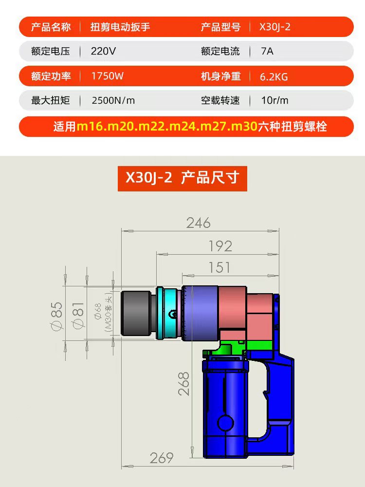 High power torsion shear wrench, x30j-2 torsion shear wrench is applicable to six kinds of M16-30 torsion shear bolts, and special wrench for steel structure high-strength bolts torsion shear bolts. The whole machine is guaranteed for two years, and the socket is guaranteed for life (the socket is replaced free of charge if it is broken)