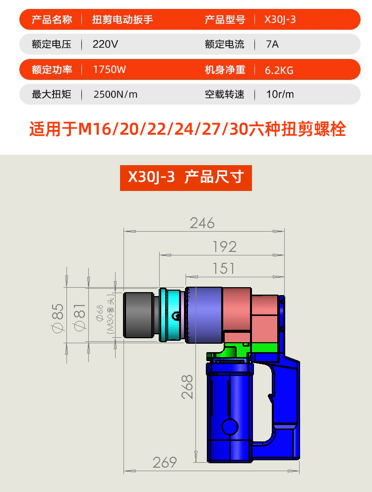 X30j-3扭剪扳手適用于m16-30六種扭剪螺栓