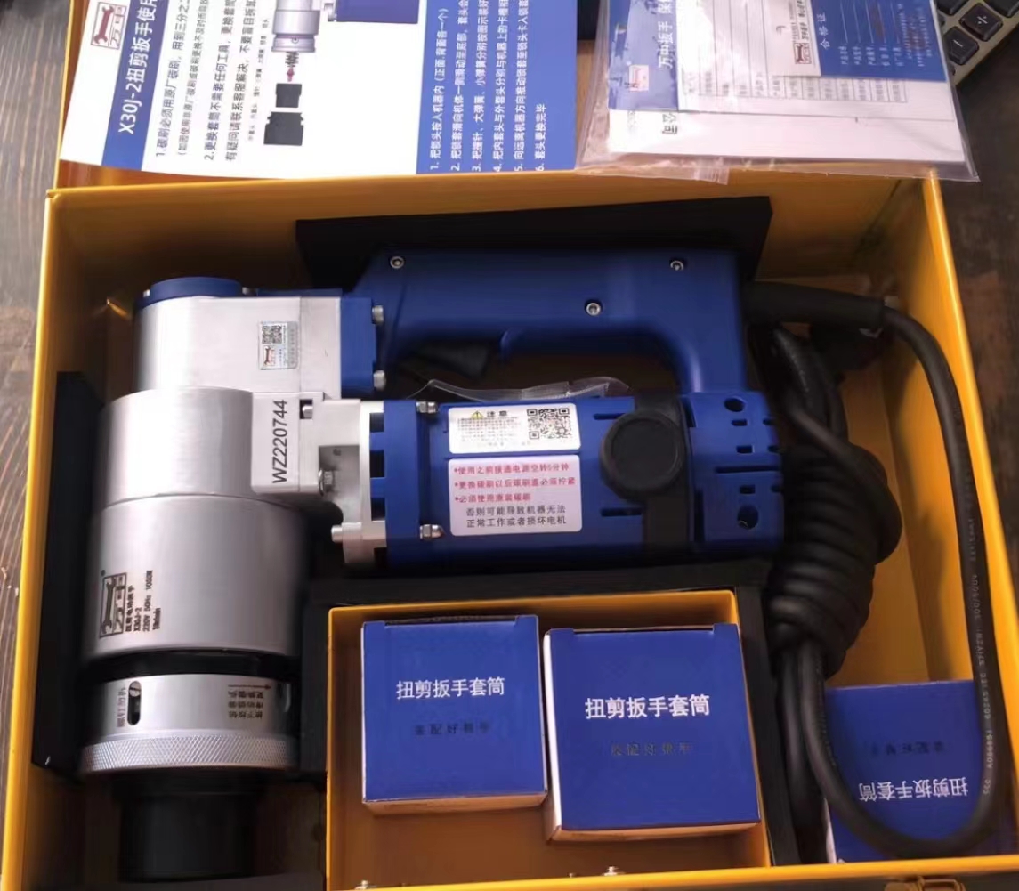 The electric torque shear wrench is specially used to fasten high-strength torque shear bolts, and after the fastening is completed, keep the cut torx head inside the sleeve, and then pull the trigger to eject the torx head. The power is 220V or 110V AC power supply. Compared with the traditional hexagon bolt, the torque shear bolt and the electric torque shear wrench are convenient and fast for construction, accurate torque control, and convenient for inspection.